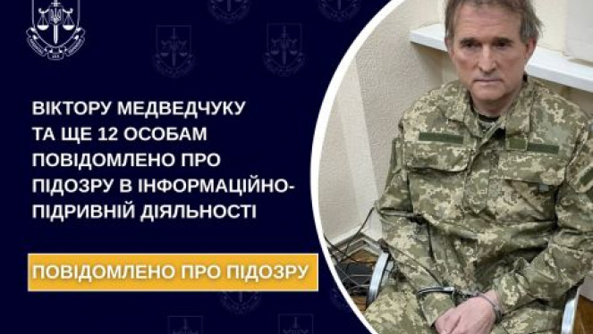 Віктор Медведчук та 12 членів організованої групи, підозрюються у роботі на військово-політичне керівництво рф, зокрема проведенні підри...