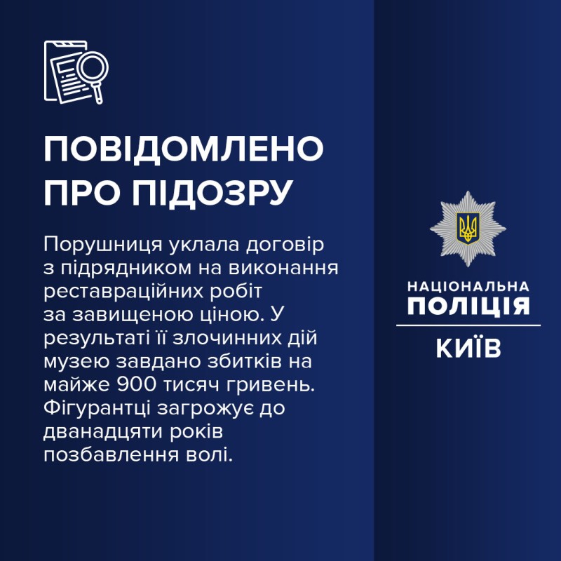 «В ході досудового розслідування ми встановили, що порушниця підписала акти приймання виконаних робіт, у яких вартість будівельних матеріалів була значно завищена. Відтак своїми діями вона завдала збитків Національному музею на суму 868 тисяч гривень»