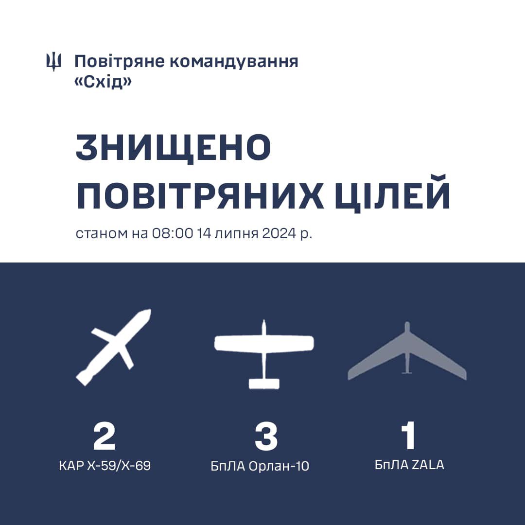 Проти ночі 14 липня 2024 року протиповітряною обороною сходу України збито дві керовані авіаційні ракети типу Х-59/Х-69 та чотири розвідувальні БпЛА розвідники: три «Орлан -10» і один «ZALA».