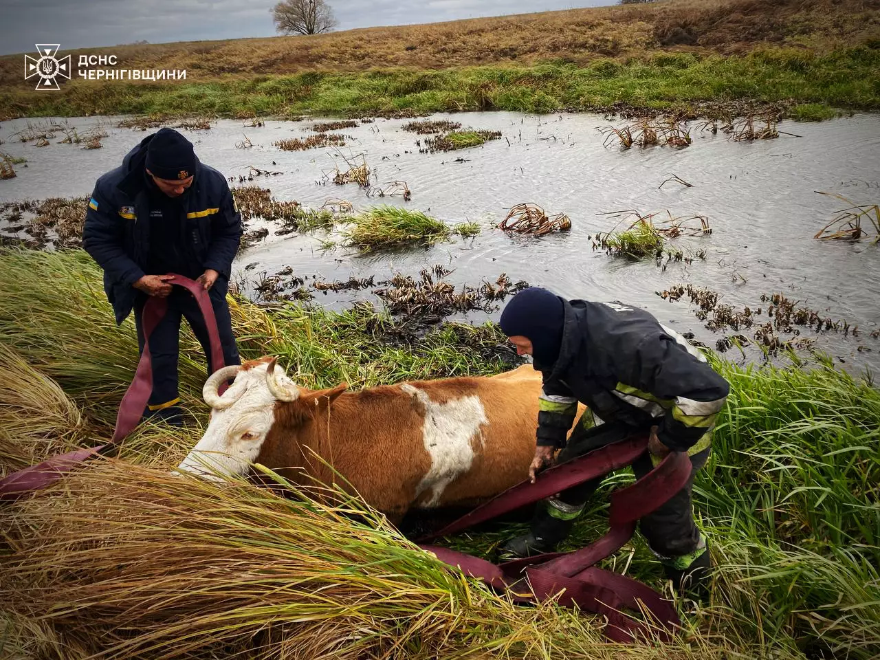 На Чернігівщині бійці ДСНС врятували рогату, яка застрягла біля берегу у водоймі. ФОТО