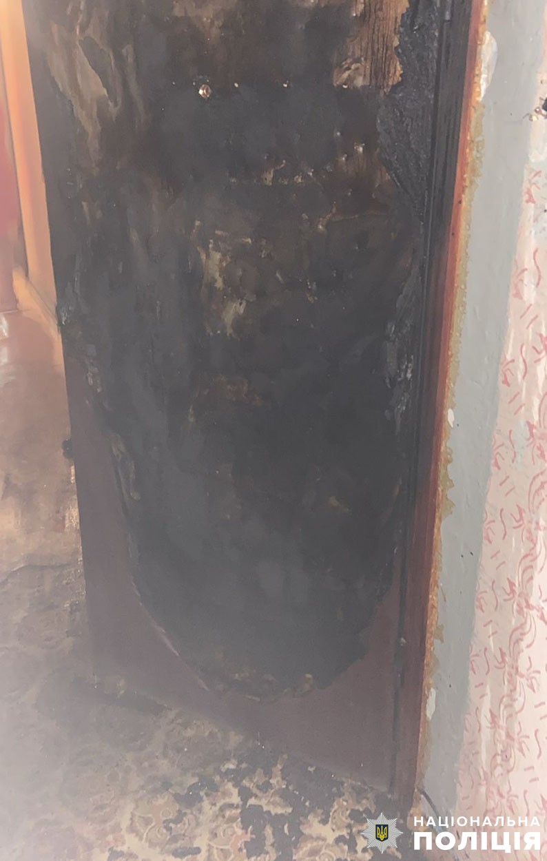 Заявниця розповіла правоохоронцям, що перед пожежею у двері сусідської квартири голосно гримав невідомий їй чоловік, а через деякий вона час побачила, що двері горять.