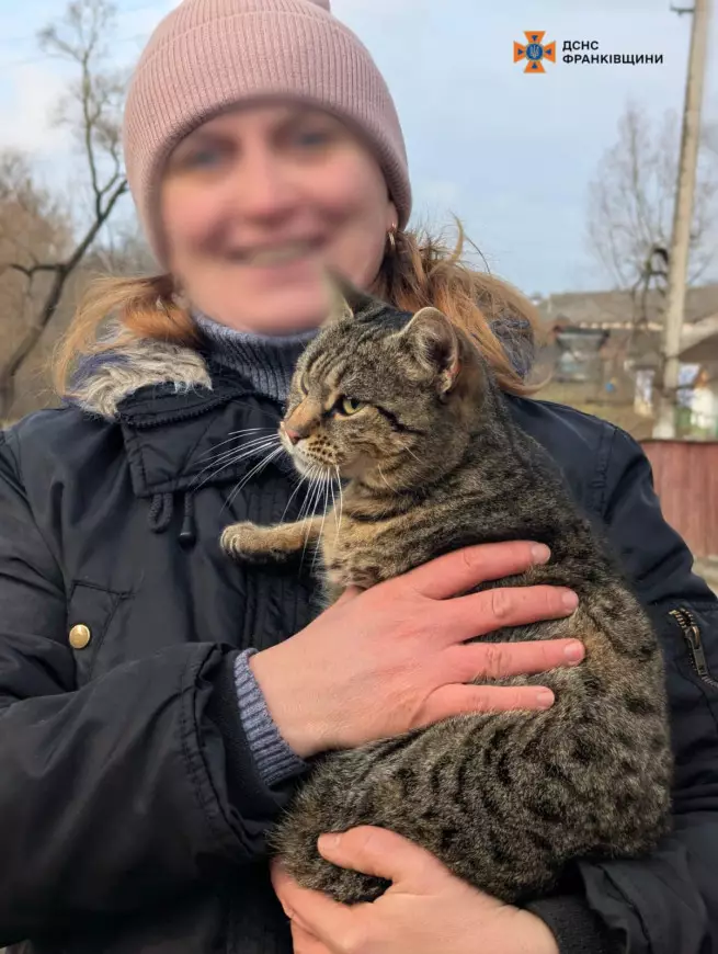 За допомогою автодрабини Снятинські рятувальники зняли котика із висоти, та передали власникам.