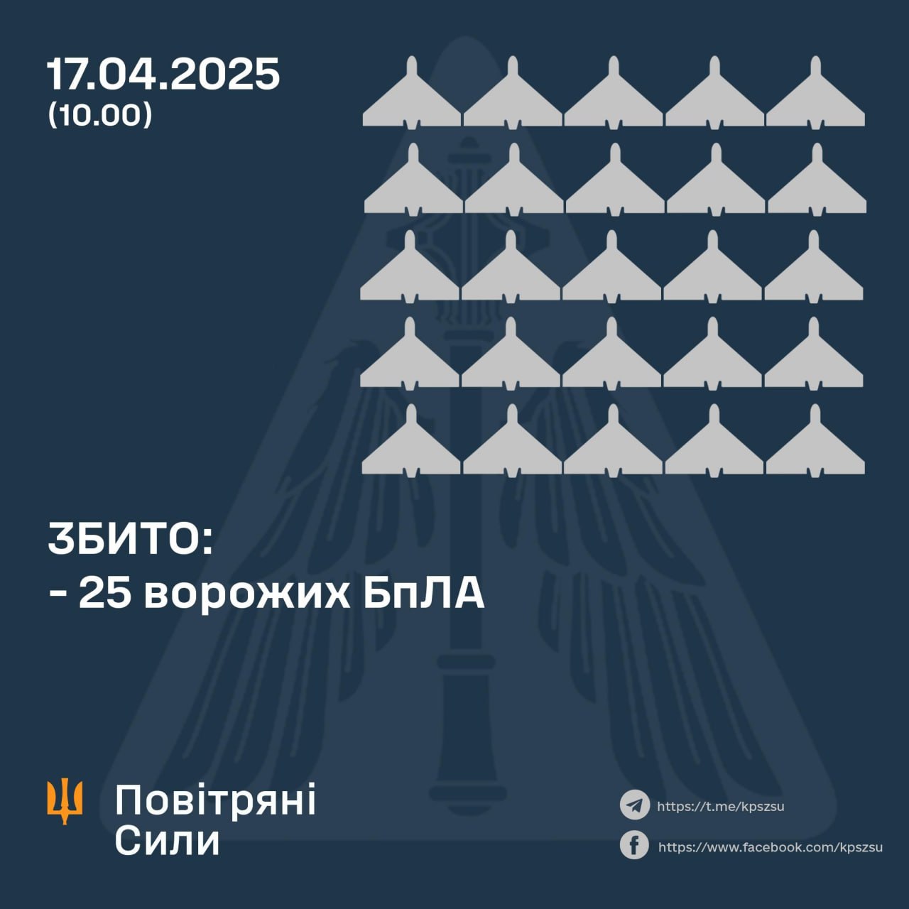 💥 Станом на 10.00 підтверджено збиття 25 ударних БпЛА типу Shahed (безпілотників інших типів) на сході, півночі, півдні та центрі країни.