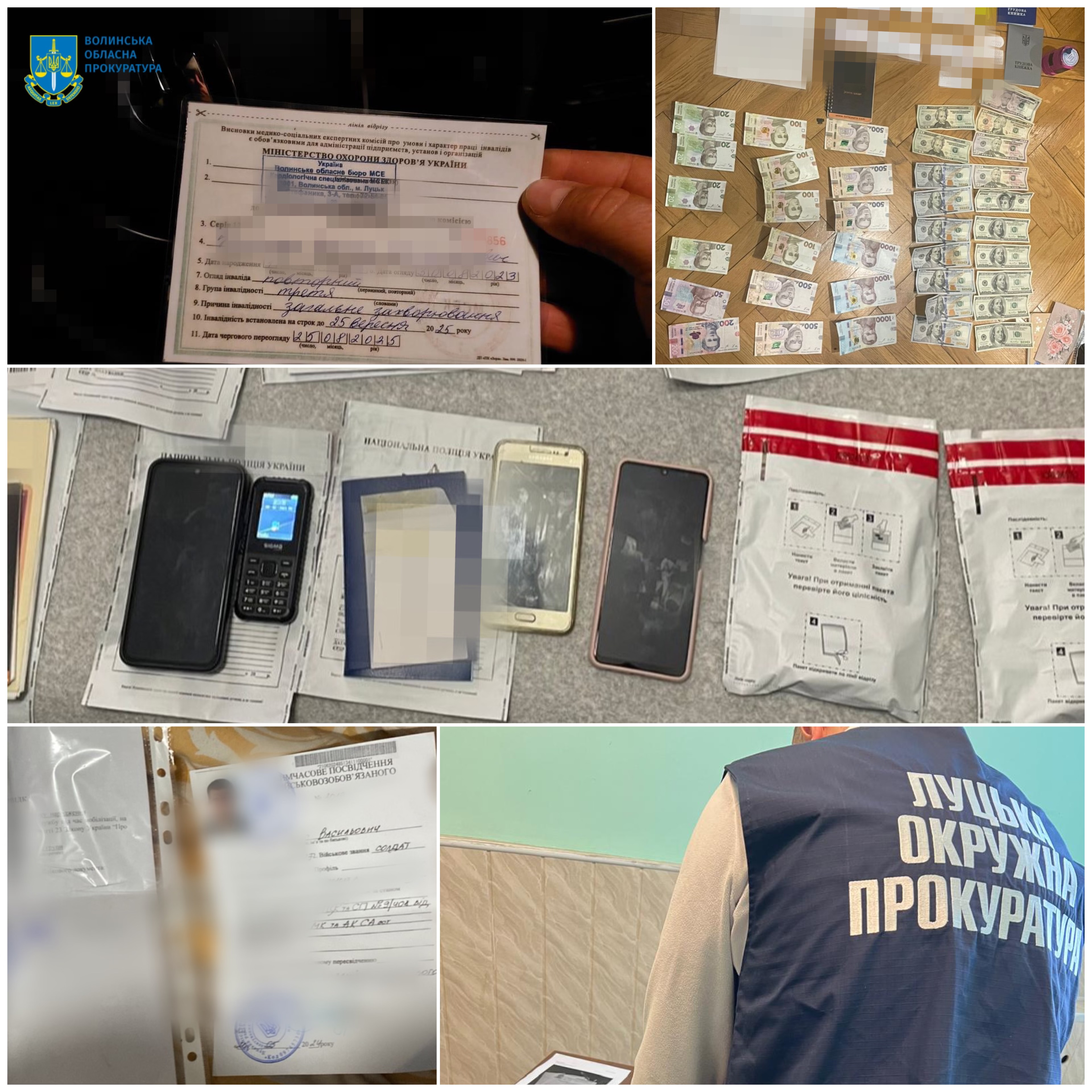 У ході санкціонованих судом обшуків у фігурантів провадження вилучено грошові кошти, кліше штампів та печаток різних установ, дотичних до видачі документів військовозобов’язаним, підроблені документи, у тому числі довідки МСЕК про встановлення інвалідності, ноутбуки, флешносії, мобільні телефони та чорнові записи.