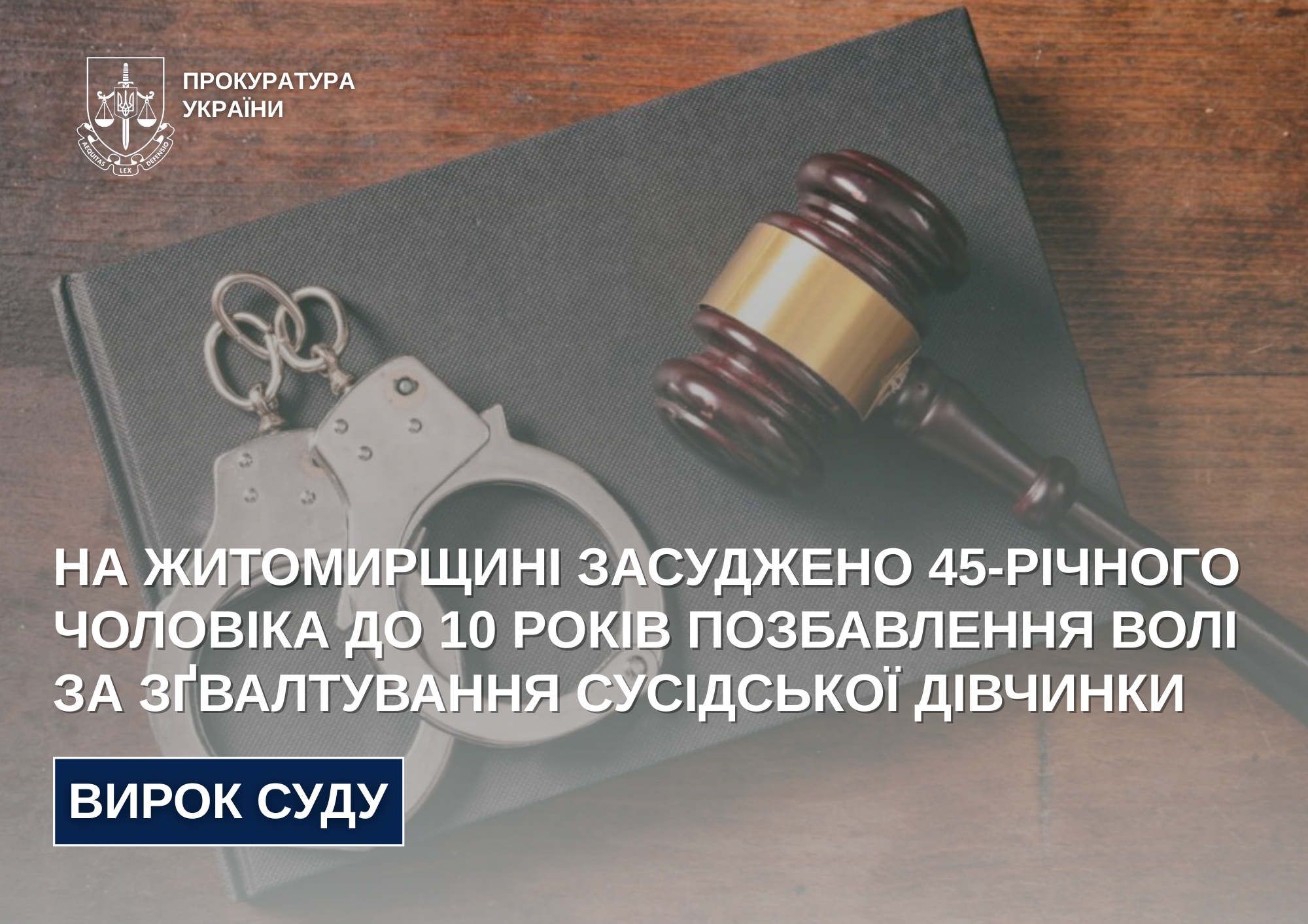 За підтримання публічного обвинувачення Коростишівської окружної прокуратури 45-річного жителя Житомирського району визнано винним у зґвалтуванні 13-річної сусідської дівчинки.