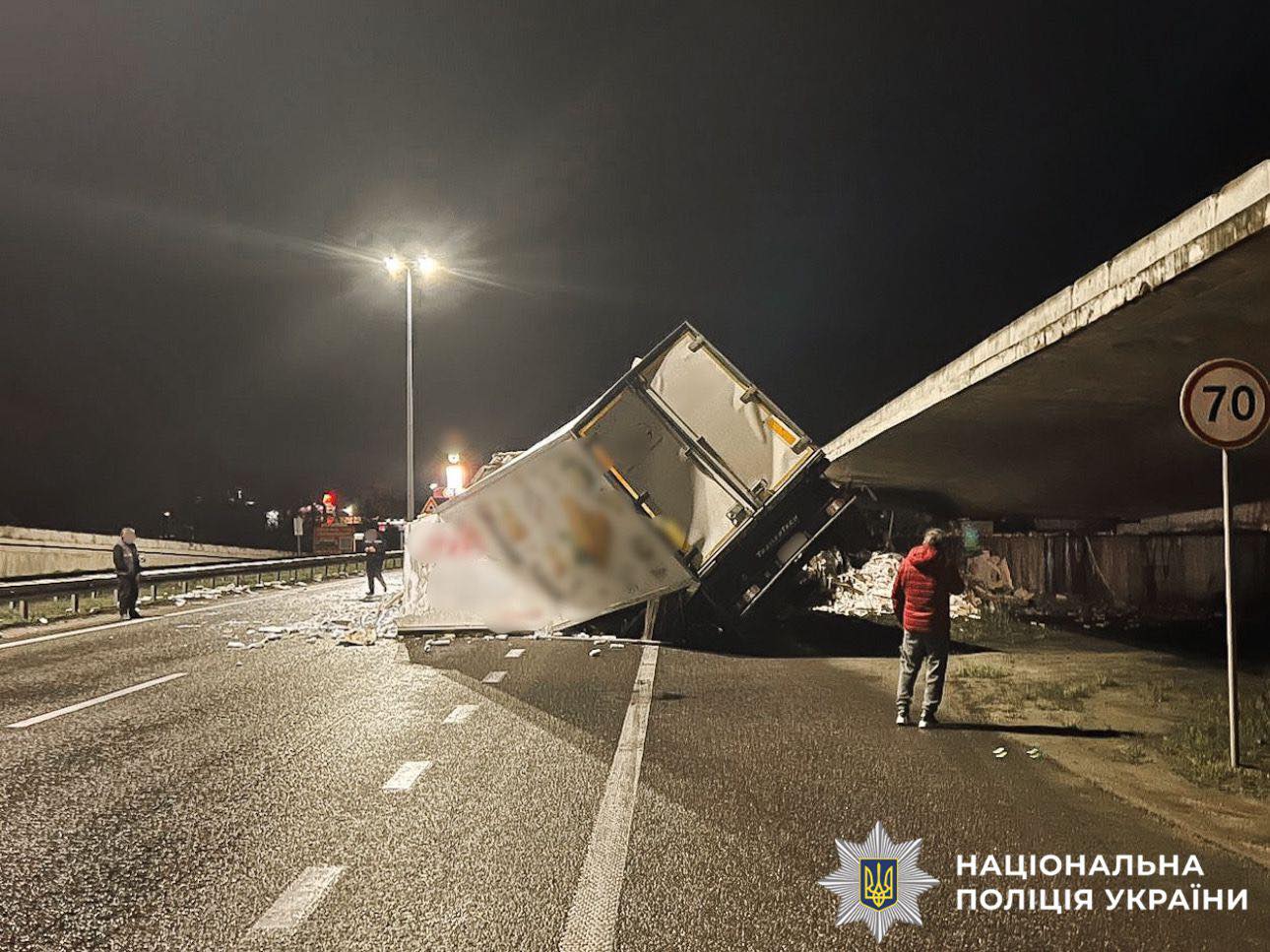 Попередньо правоохоронці встановили, що 39-річний водій вантажного автомобіля MAN із причепом MS-Parts, рухаючись у напрямку міста Києва, здійснив наїзд на опору мосту.