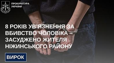За публічного обвинувачення прокурорів Ніжинської окружної прокуратури визнано винним жителя Ніжинщини в умисному вбивстві. Його засуджено до 8 років позбавлення волі.