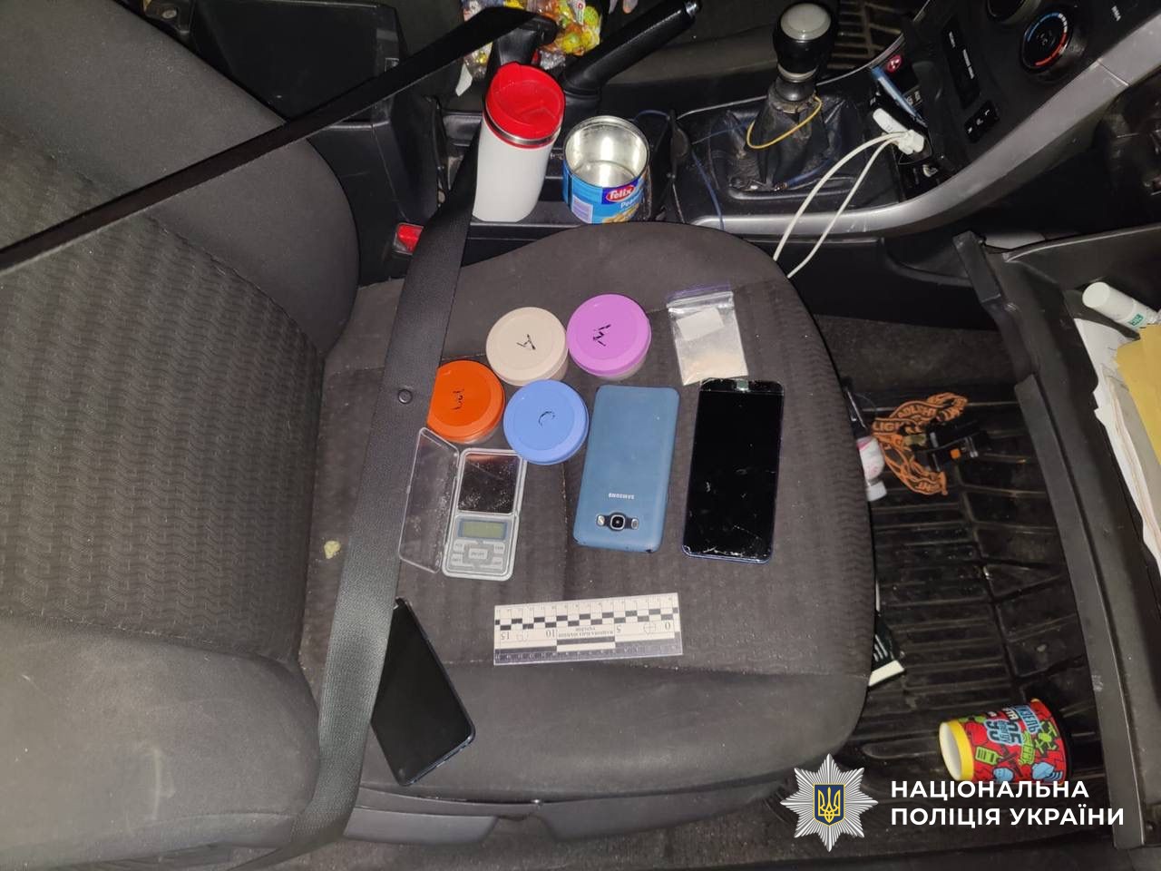 Під час слідчих дій в орендованому автомобілі фігуранта було виявлено поліетиленові пакети з амфетаміном та канабісом, ваги, мобільні телефони, конверти для фасування та близько 12 000 гривень. Крім того, було проведено обшук за місцем проживання чоловіка, де виявлено та вилучено пакет з засушеними грибами невідомого походження, порошкоподібні речовини та рослини, по яких проводиться експертне дослідження.