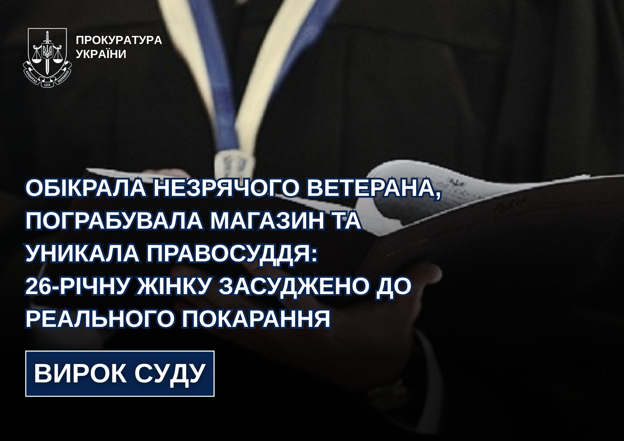 За даними слідства, засуджена обікрала незрячого потерпілого – ветерана-військовослужбовця з інвалідністю І групи. Вона шахрайськи заволоділа його мобільним телефоном та банківською карткою, з якої зняла з понад 6000 грн.