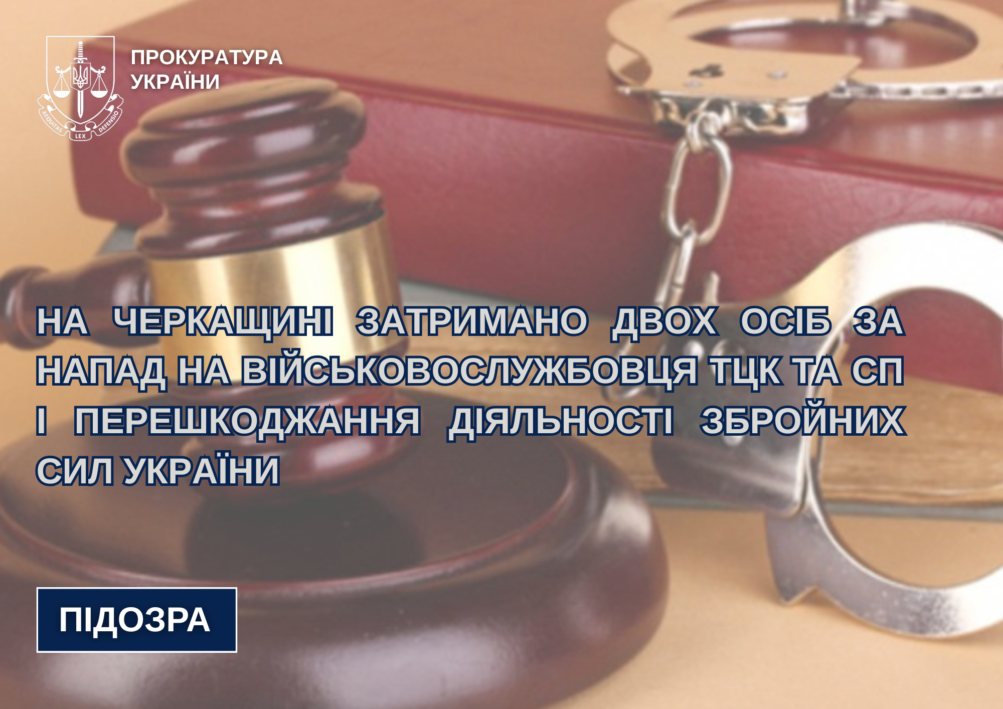 За процесуального керівництва прокурорів Черкаської обласної прокуратури на території Черкаського району Черкаської області повідомлено про підозру двом уродженцям м. Черкаси за фактами умисного заподіяння легкого тілесного ушкодження службовій особі у зв’язку з її службовою діяльністю та перешкоджання законній діяльності Збройних Сил України в особливий період, вчинених за попередньою змовою групою осіб.