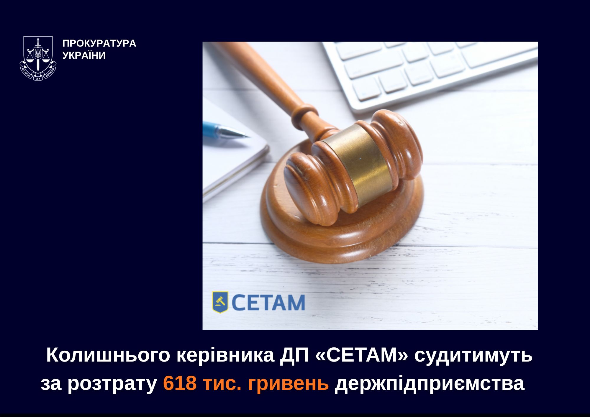 Прокурорами Подільської окружної прокуратури міста Києва скеровано до суду обвинувальний акт щодо колишнього директора ДП «СЕТАМ» за обвинуваченням у розтраті майна, шляхом зловживання службовою особою своїм службовим становищем, вчинене в особливо великих розмірах.