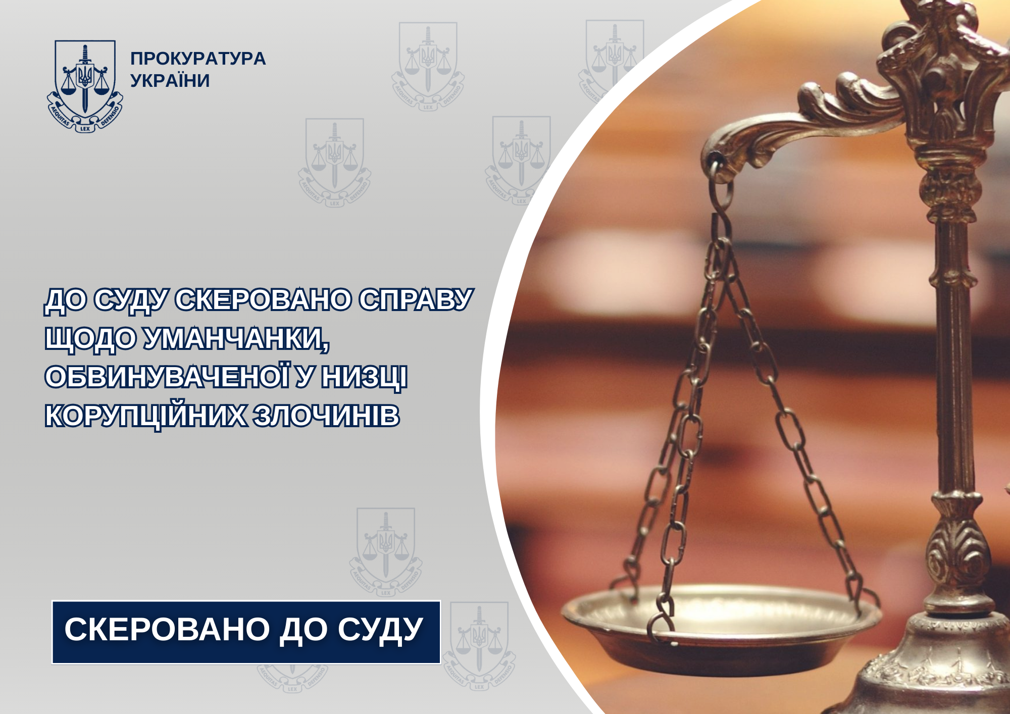 Прокурорами Уманської окружної прокуратури направлено до суду обвинувальний акт стосовно 47-річної уманчанки, яку обвинувачують у вчиненні низки корупційних злочинів( чч. 1, 2, 3 ст. 369-2 КК України).