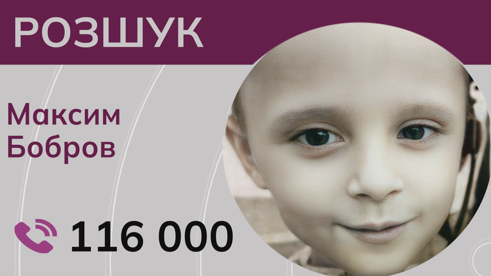У квітні наступного року Максиму має виповнитися шість років. Хлопчик має кругле обличчя та коротке русяве волосся. Ми просимо уважно подивитися на його фотографію — можливо, саме ви володієте інформацією, яка допоможе знайти дитину.