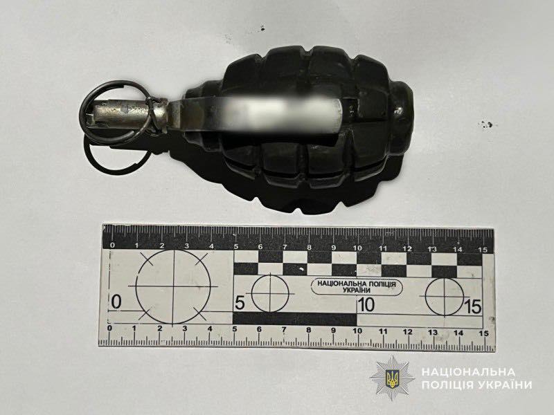 На місце подій виїхала слідчо-оперативна група, яка встановила особу правопорушника та затримала його. Під час огляду поліцейські вилучили гранату Ф-1 та запал УЗРГМ, які направлено на експертизу.