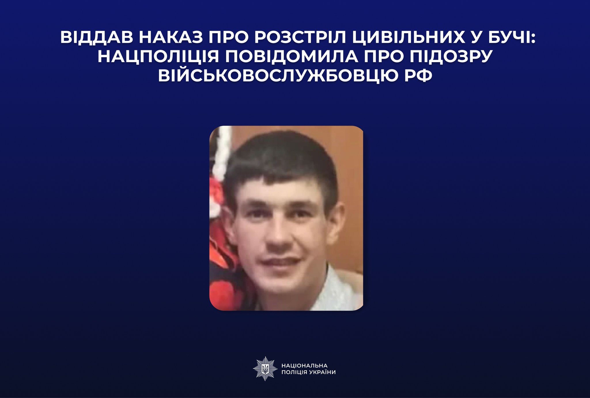Слідчі Головного слідчого управління Національної поліції України повідомили про підозру військовослужбовцю збройних сил російської федерації, який у березні 2022 року брав участь у збройній агресії рф проти України на території Київської області. Санкція статті передбачає позбавлення волі на строк до 15 років або довічне позбавлення волі.