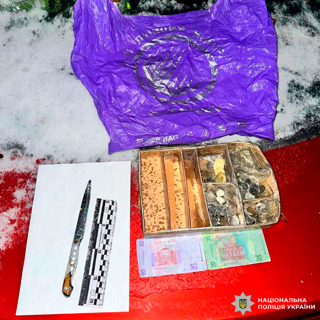 Неподалік магазину правоохоронці виявили ніж та коробку з дріб'язковими грошима, в якій продавчиня зберігала касу.