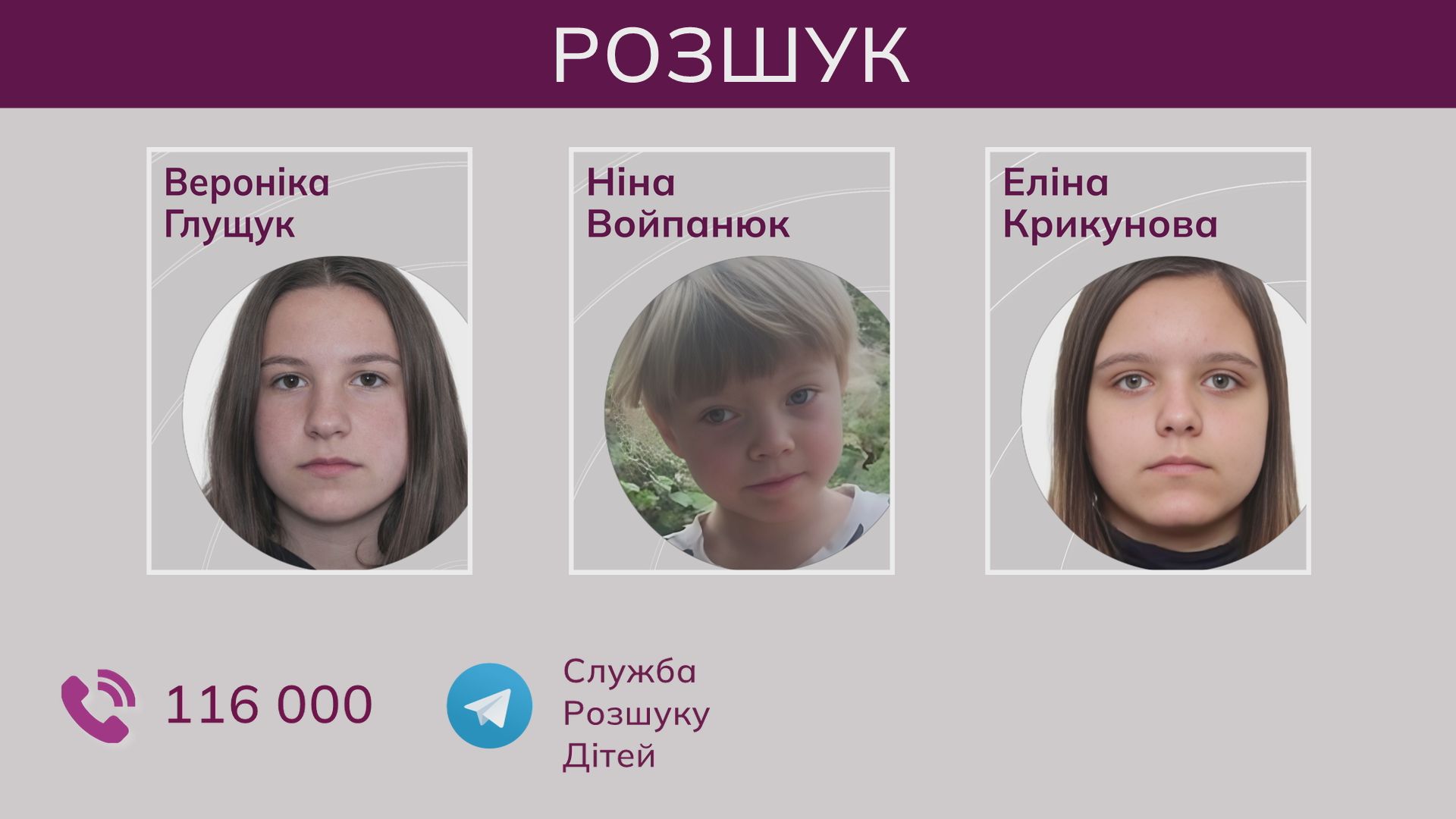 П’ятнадцятирічна Вероніка Глущук, шестирічна Ніна Войпанюк та шістнадцятирічна Еліна Крикунова зникли під час повномасштабної війни на території Донецької області. Наразі їхнє місцеперебування залишається невідомим.