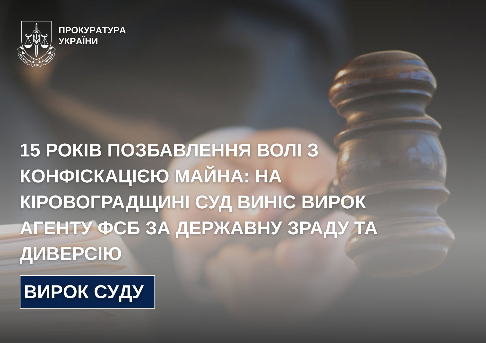 Суд визнав особу винною за ч. 2 ст. 111 Кримінального кодексу України (державна зрада, вчинена в умовах воєнного стану) та за ч. 2 ст. 113 КК України (диверсія). Остаточне покарання призначено за сукупністю злочинів — 15 років позбавлення волі з конфіскацією всього майна.