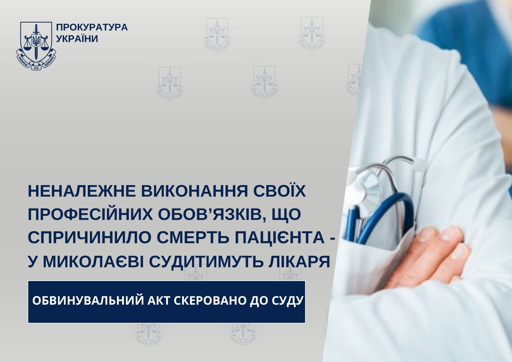 Прокурорами Окружної прокуратури міста Миколаєва скеровано до суду обвинувальний акт стосовно лікаря відділення хірургічної стоматології КНП «Миколаївська обласна клінічна лікарня» за фактом неналежного виконання ним своїх професійних обов’язків внаслідок недбалого до них ставлення, що спричинило тяжкі наслідки для хворого.