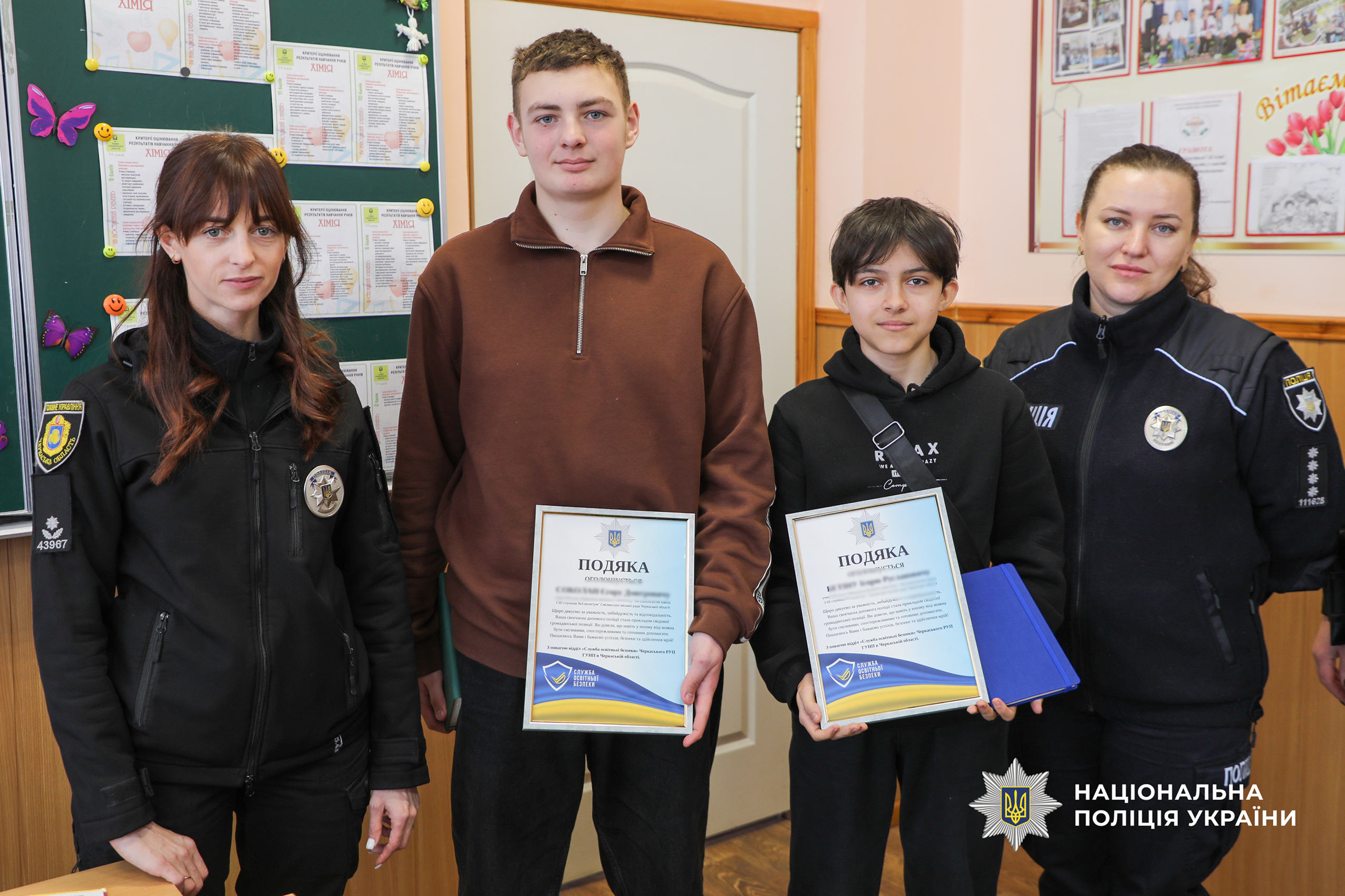 Інспектори Служби освітньої безпеки Черкаського районного управління поліції вручили подяки двом учням 9-В класу НВК «ЗОШ І–ІІІ ступенів № 3-колегіум» Смілянської міської ради.