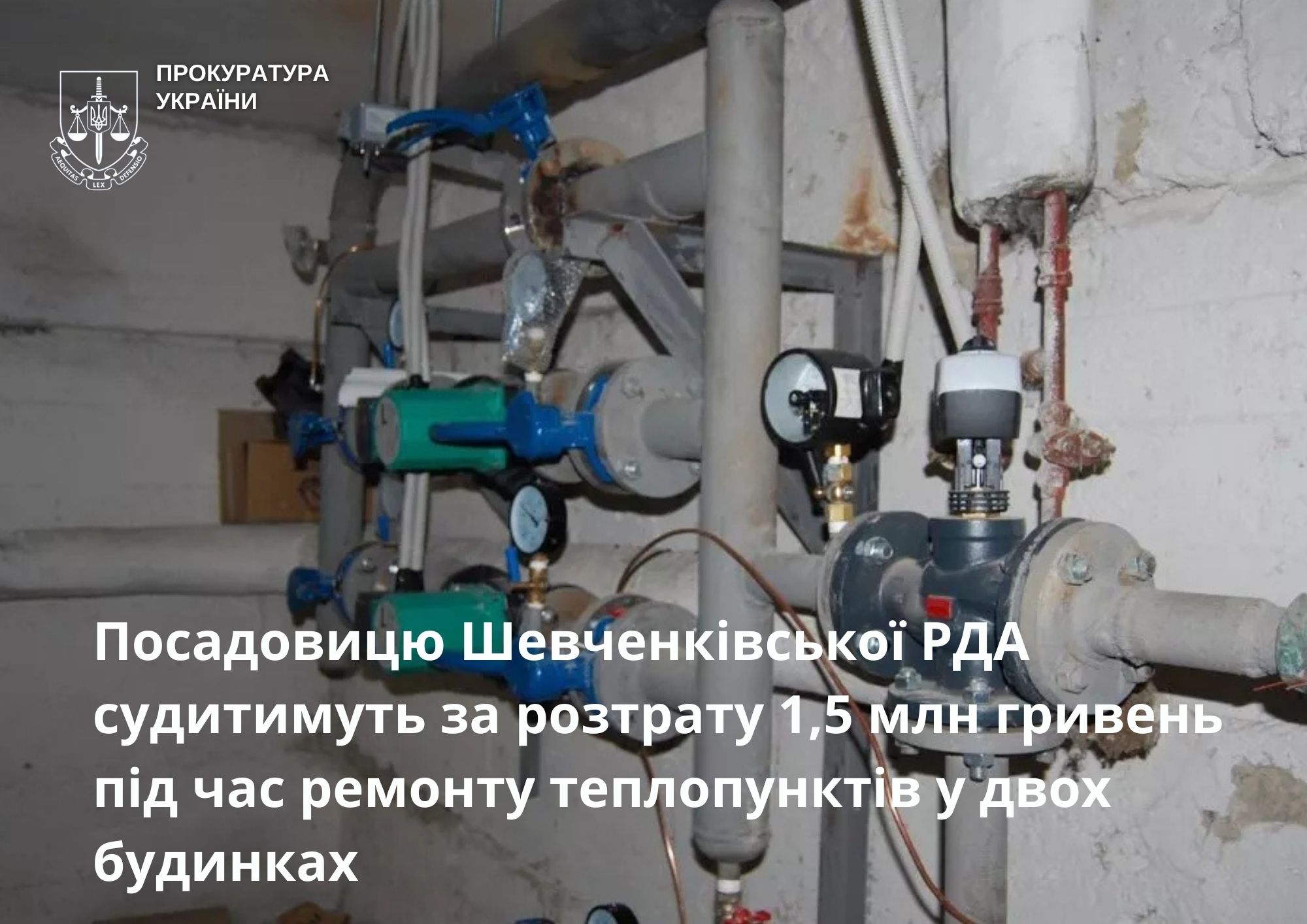 Встановлено, що виконуючи обов’язки керівника одного з управлінь Шевченківської РДА, обвинувачена забезпечила оплату робіт з капітального ремонту (модернізації) індивідуальних теплових пунктів у двох житлових будинках Шевченківського району міста Києва. Однак встановлене обладнання, його технічні характеристики та обсяги виконаних робіт не відповідали проєктно-кошторисній документації та умовам укладених договорів.