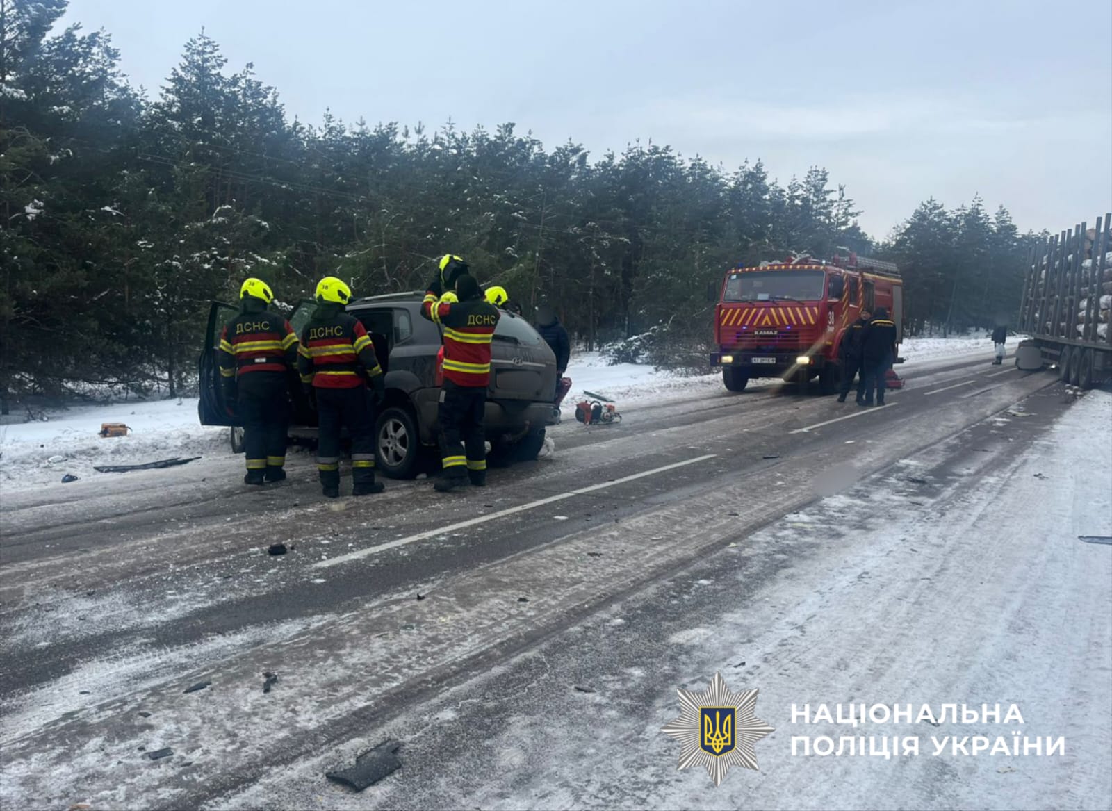 Попередньо правоохоронці зʼясували, що 55-річний водій автомобіля Hyundai Tucson не впорався з керуванням та здійснив виїзд на смугу зустрічного руху, де зіткнувся з сідловим тягачем DAF, під керуванням 61-річного керманича.