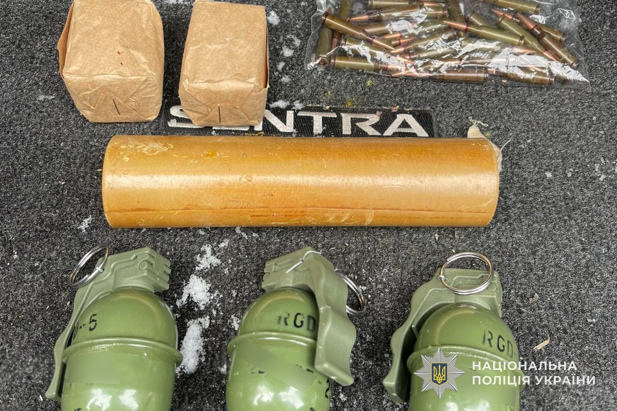 Під час поверхневого огляду автомобіля в багажному відділенні правоохоронці виявили камуфльований рюкзак одного з пасажирів. Усередині знаходилися три гранати РГД-5 із запалами, 89 патронів калібру 5,45 мм та димова граната.