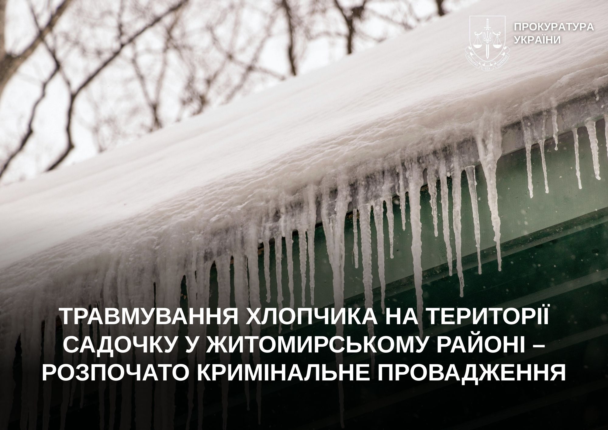 На території дошкільного навчального закладу у Житомирському районі внаслідок падіння снігу з даху будівлі травмувався хлопчик 2021 року народження. Подія сталася під час прогулянки дитини разом із вихователем та іншими дітьми.