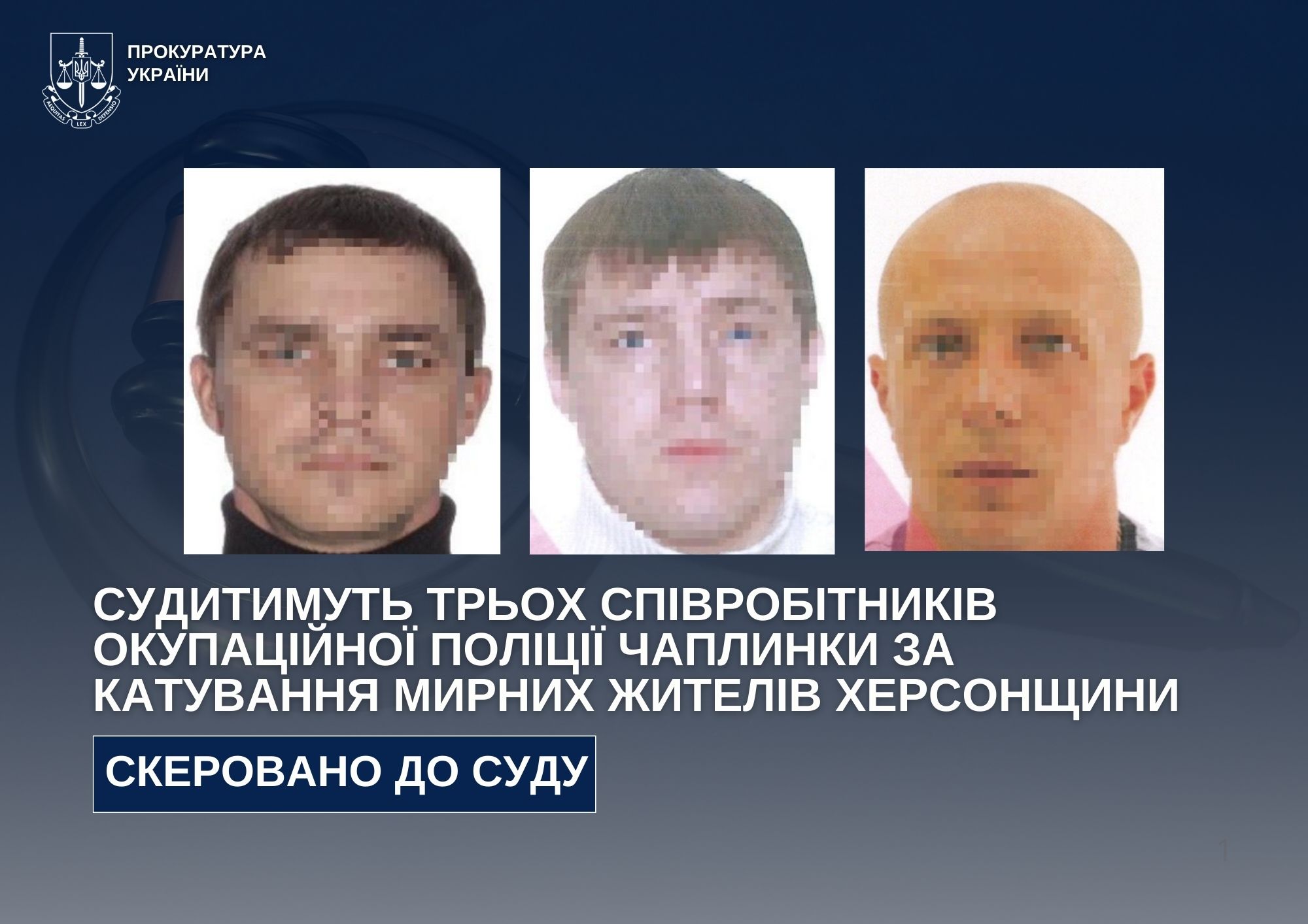 Прокурори Херсонської обласної прокуратури скерували до суду обвинувальний акт стосовно трьох учасників незаконно створеного «отдела Министерства внутренних дел по Чаплынскому МО ГУ МВД Херсонской области». Їм інкримінують жорстоке поводження з цивільним населенням. Двох із них також обвинувачують у добровільному зайнятті посад у незаконному правоохоронному органі.