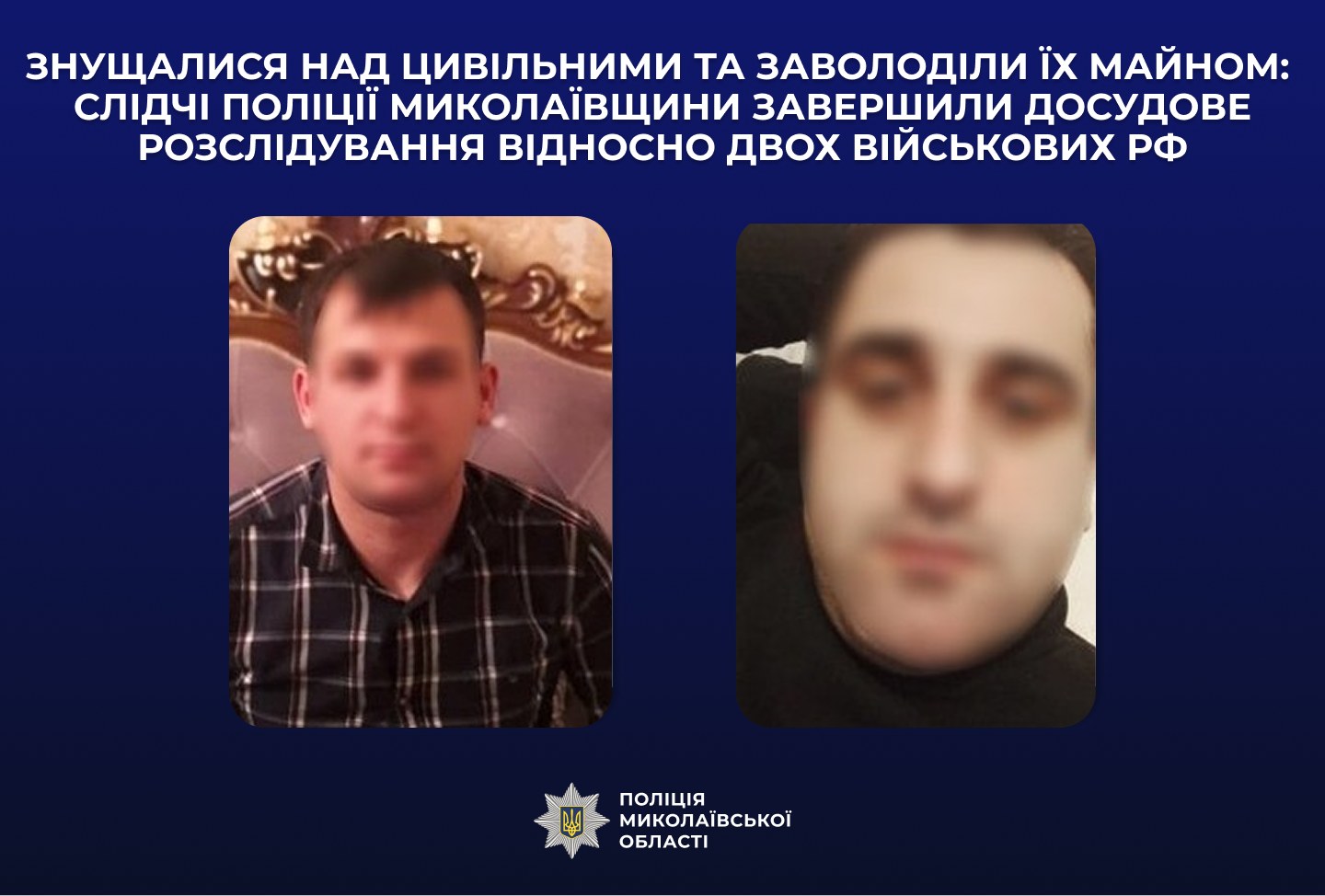 У ході досудового розслідування слідчі відділу розслідування злочинів, учинених в умовах збройного конфлікту за участі фахівці управління кримінального аналізу обласного главку поліції встановили, що у квітні 2022 року в одному із окупованих населених пунктів Снігурівської міської громади Баштанського району, двоє військовослужбовців рф, які на момент вчинення злочинів перебували на посадах командира та механіка-водія танку танкового батальйону 205-ї окремої мотострілецької козачої бригади рф, застосували фізичне насильство до місцевого жителя, били його прикладом від автомата по тулубу, гасили об руку недопалки від цигарок та змушували упродовж пів року голіруч, без жодного приладдя, розвантажувати і навантажувати зернові культури.