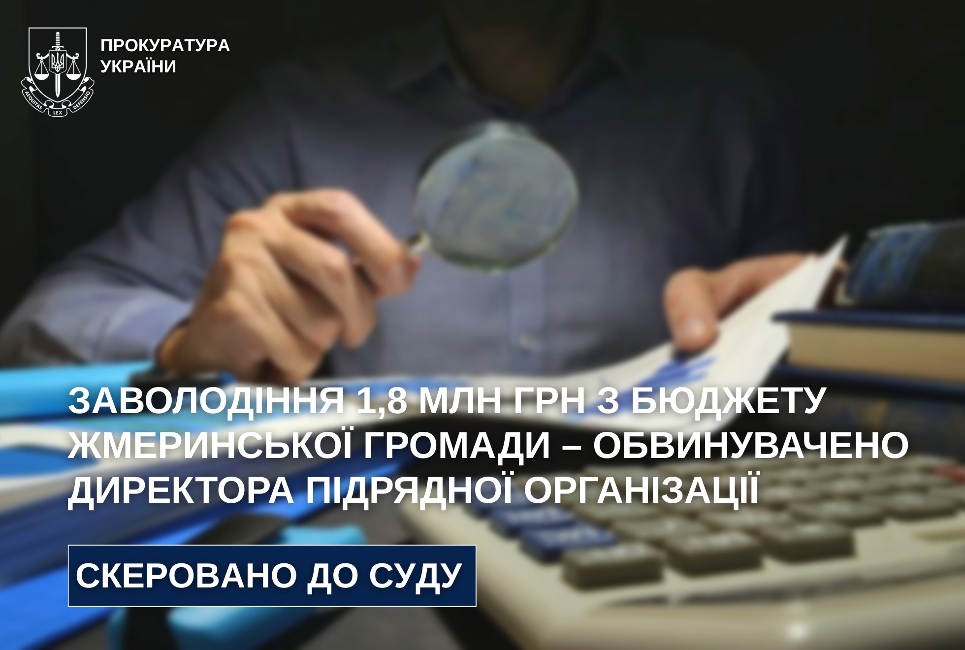 За процесуального керівництва прокурорів Жмеринської окружної прокуратури завершено досудове розслідування та направлено до суду обвинувальний акт стосовно директора підрядної організації, який обвинувачується у заволодінні бюджетними коштами в особливо великих розмірах і внесенні до офіційних документів завідомо неправдивих відомостей, що спричинило тяжкі наслідки.