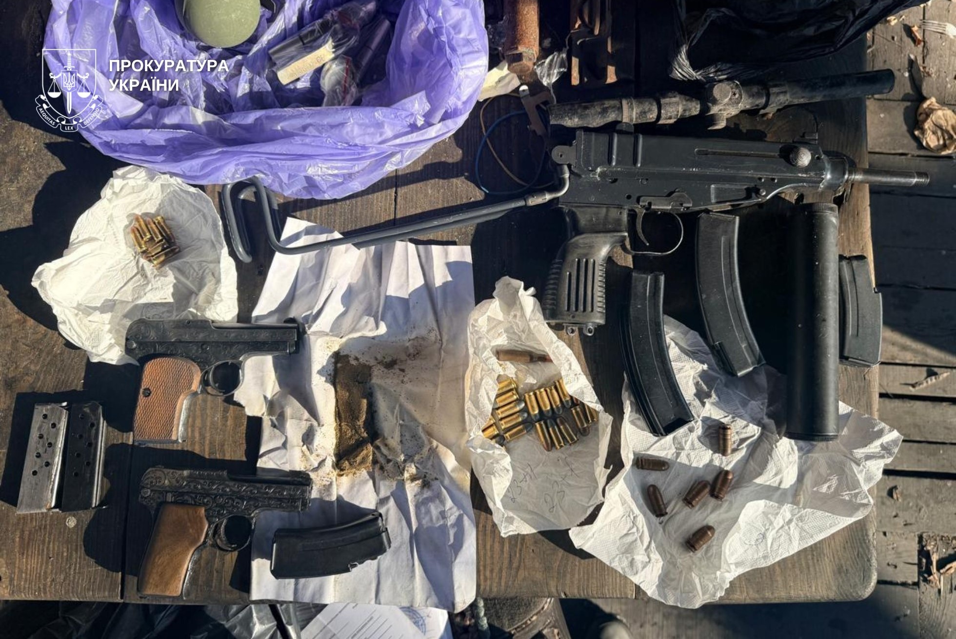 Під час санкціонованих обшуків вилучено близько 2,5 тис. патронів, 1,5 тис. гільз, рушниці, гвинтівки, пістолети та набої до них, гранати із запалами, димові шашки, сигнальні ракети, шаблі, кліше для печаток державних органів, мобільні телефони та комп’ютерна техніка, чорнові записи та грошові кошти у різних валютах на суму понад 880 тис. грн.