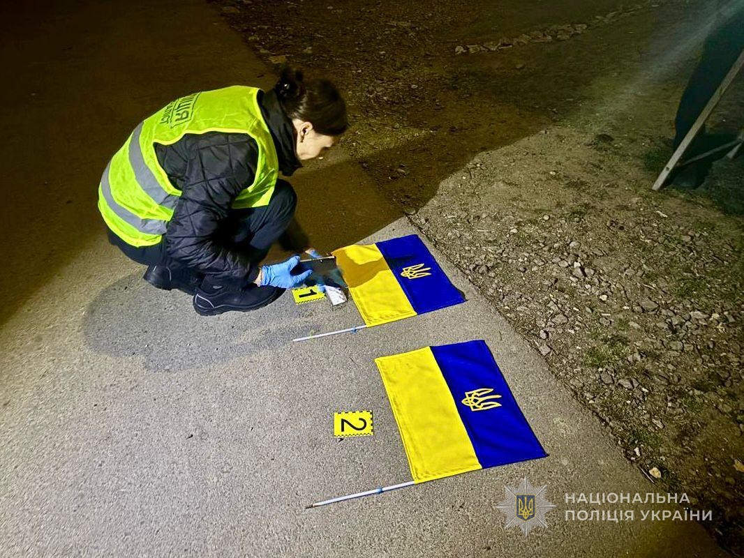 Попередньо встановлено, що в той момент, коли місцеві мешканці розвішували на електроопорах державні прапорці, фігурант зірвав два з них та викинув.