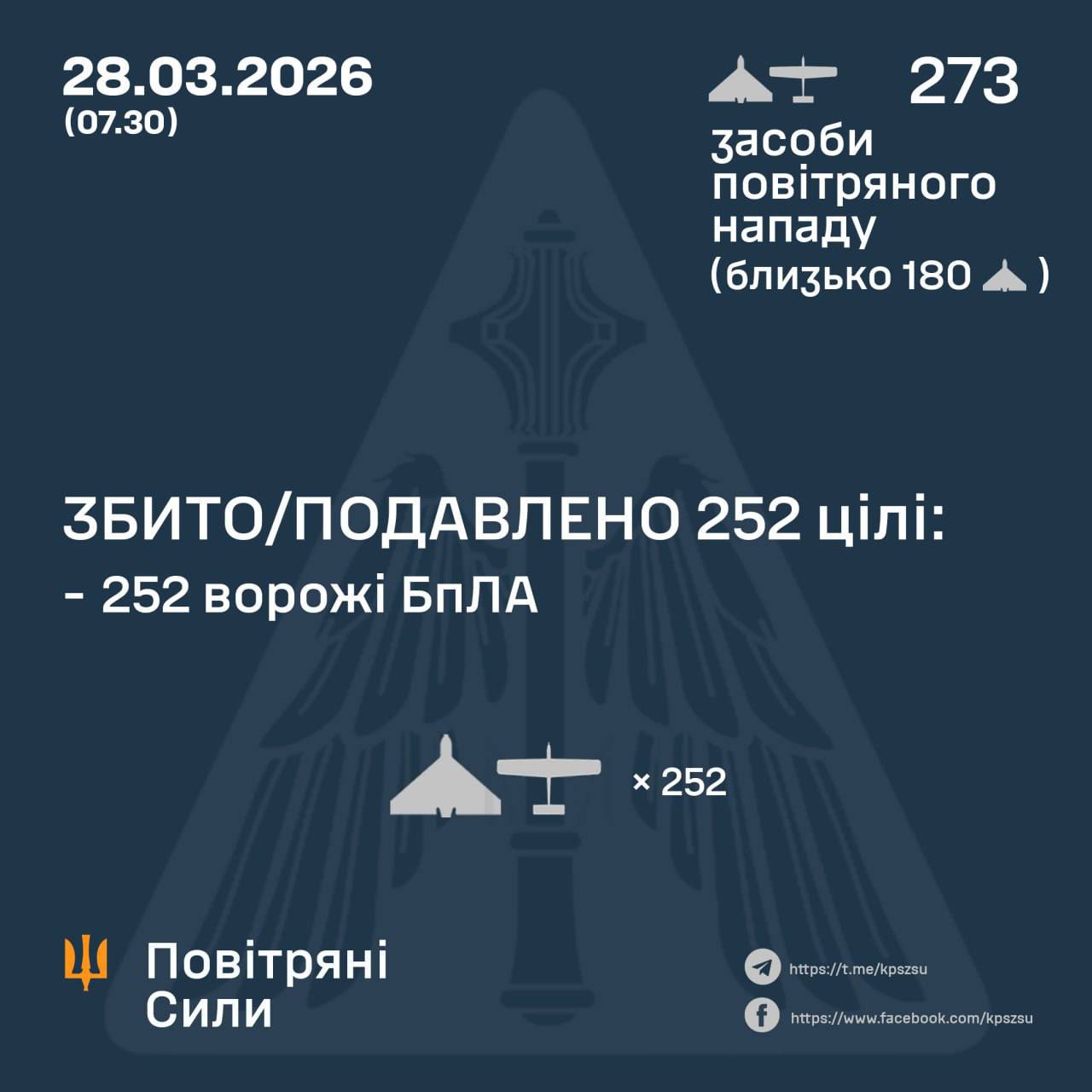 У ніч на 28 березня (з 18:00 27 березня) противник атакував 273 ударними БпЛА типу Shahed, Гербера, Італмас та безпілотниками інших типів із напрямків: Орел, Курськ, Міллєрово, Приморсько-Ахтарськ – рф., Гвардійське - ТОТ АР Крим, близько 180 із них – "шахеди".