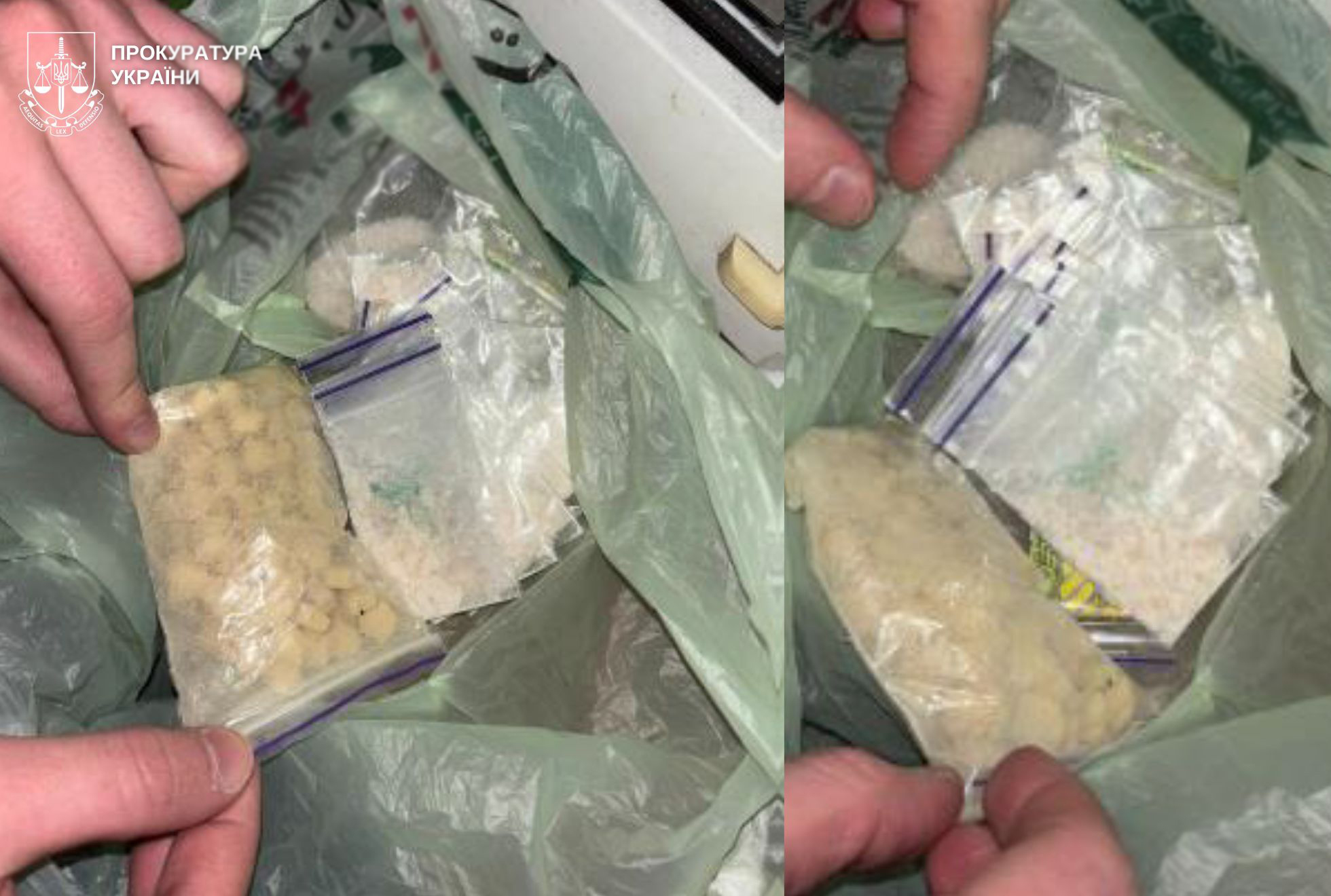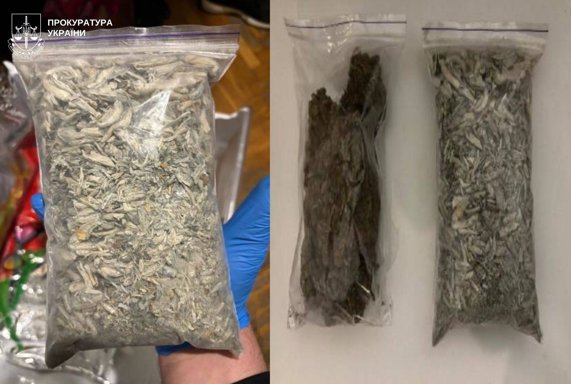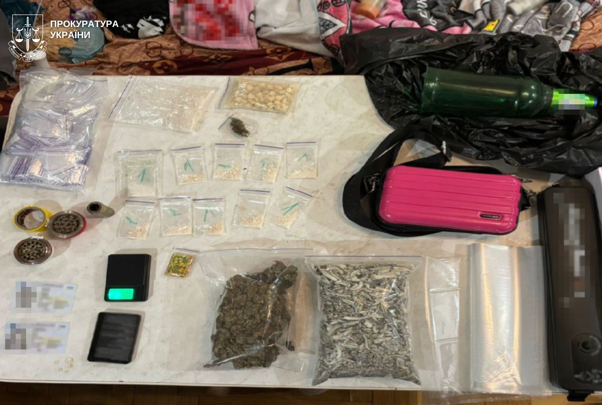 Під час обшуку за місцем проживання фігурантів вилучено речовини, зовні схожі на наркотичні засоби та психотропні речовини, зокрема: канабіс (майже 200 г), псилоцибінові гриби (майже 200 г), таблетки, схожі на MDMA (майже 100 г), речовину, схожу на PVP (майже 50 г), зіп-пакети з речовиною, схожою на мефедрон (близько 10 г), а також близько 90 марок, ймовірно з LSD.