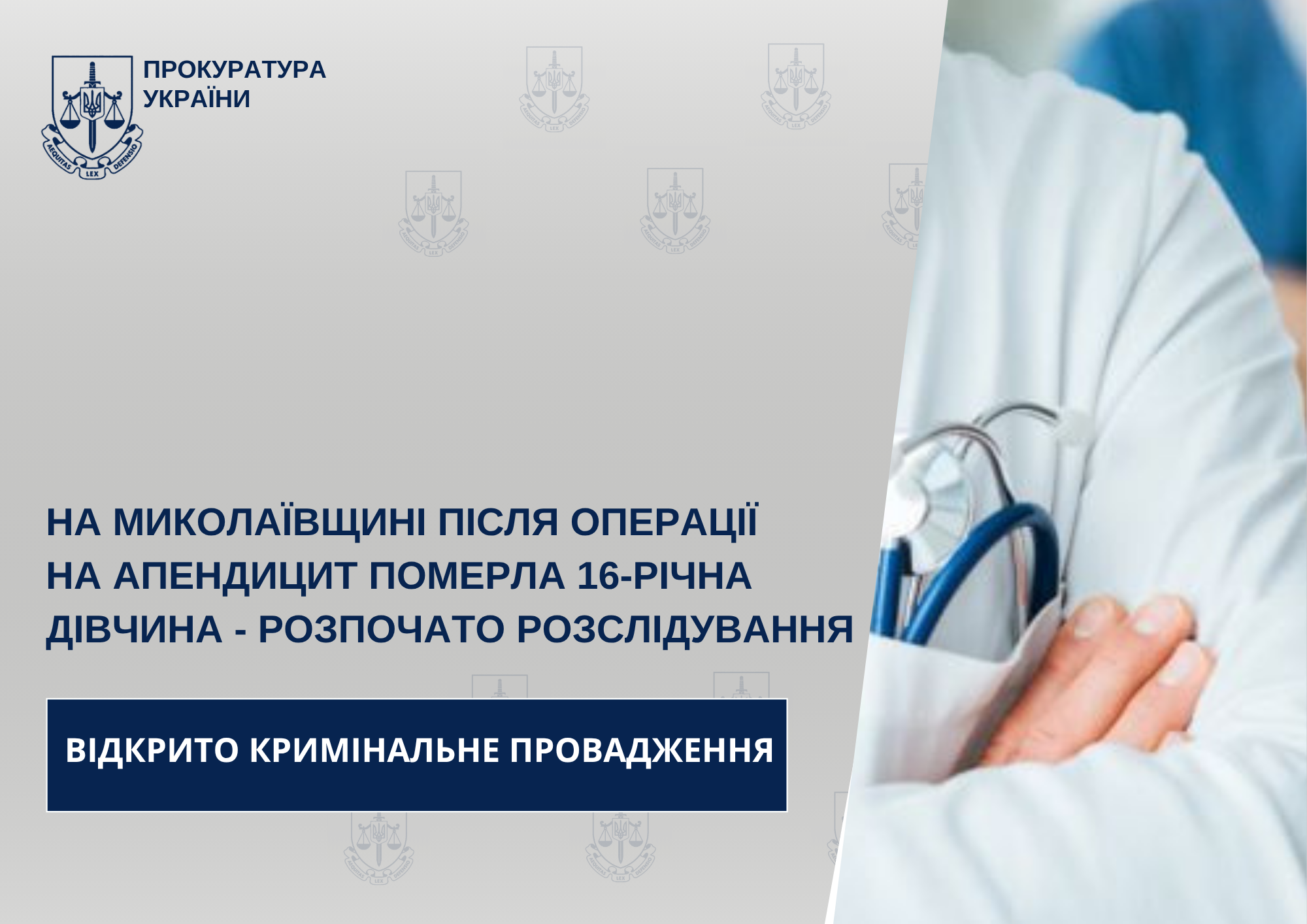 За даними слідства, 12 березня 2026 року жінка разом зі своєю 16-річною донькою звернулися до приймального відділення Вознесенської багатопрофільної лікарні з підозрою на апендицит. 14 березня дівчину оперували, однак після хірургічного втручання її стан почав погіршуватися.