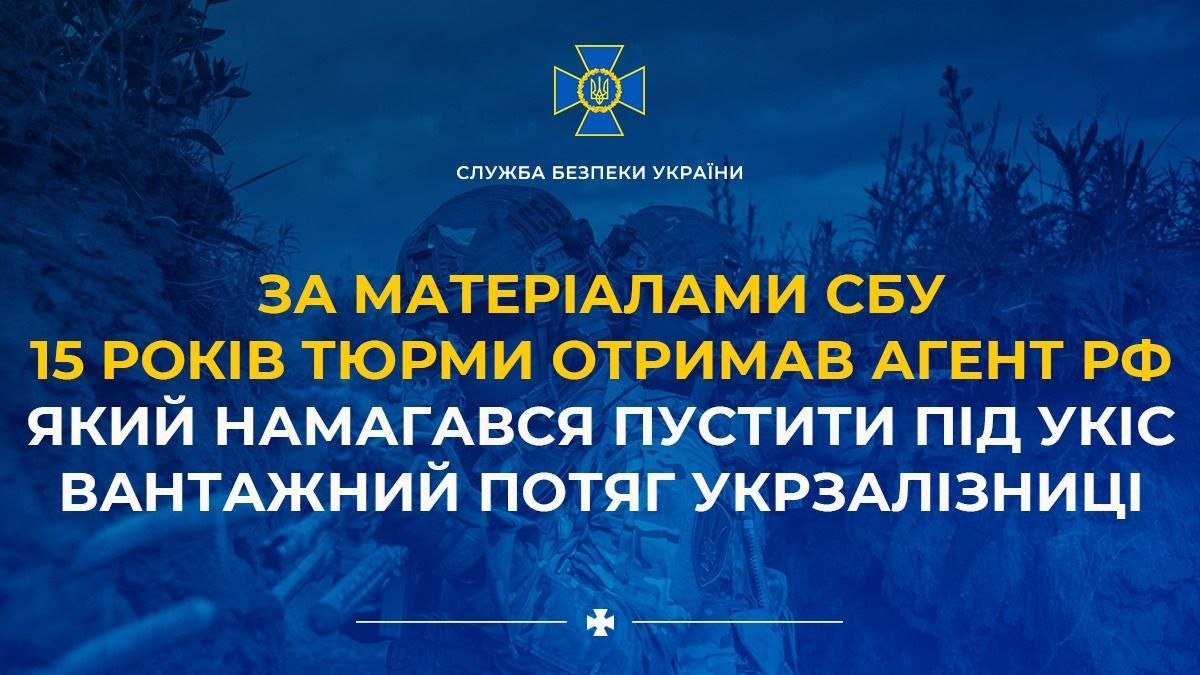 За доказовою базою контррозвідки та слідчих Служби безпеки 15 років ув’язнення з конфіскацією майна отримав ще один агент російської воєнної розвідки (більш відомої як гру). СБУ викрила його у травні 2025 року на Київщині, коли він намагався пустити під укіс вантажний потяг.
