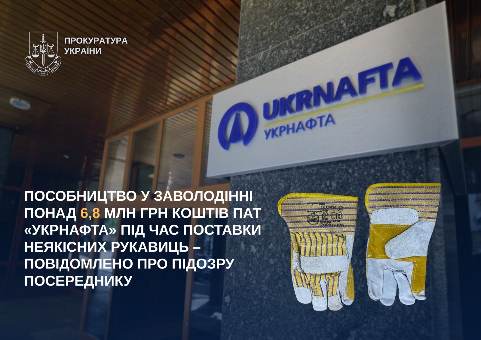 Прокурорами Печерської окружної прокуратури міста Києва представнику товариства, що постачало робочі рукавиці ПАТ «Укрнафта», повідомлено про підозру у пособництві заволодінню грошима нафтовидобувної компанії.