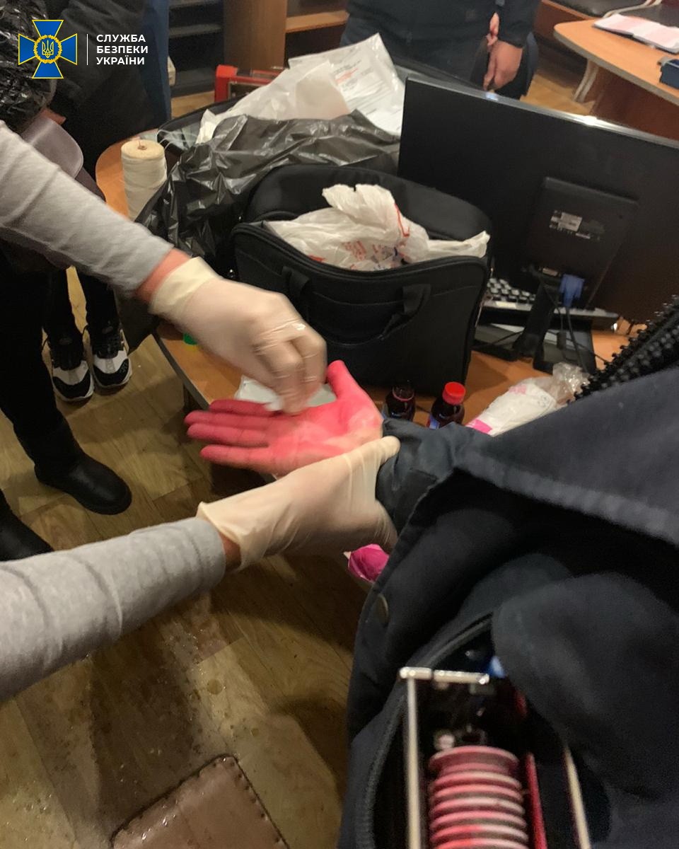 Співробітники СБУ спільно з ДБР та підрозділом внутрішньої безпеки ДФС затримали одного із фігурантів провадження – головного інспектора митниці під час отримання чергового хабара. Митник, для уникнення кримінальної відповідальності, хотів знищити сліди злочину. Він намагався сховати гроші у підвіконня службового приміщення, а долоні облив фарбою для службової печатки.