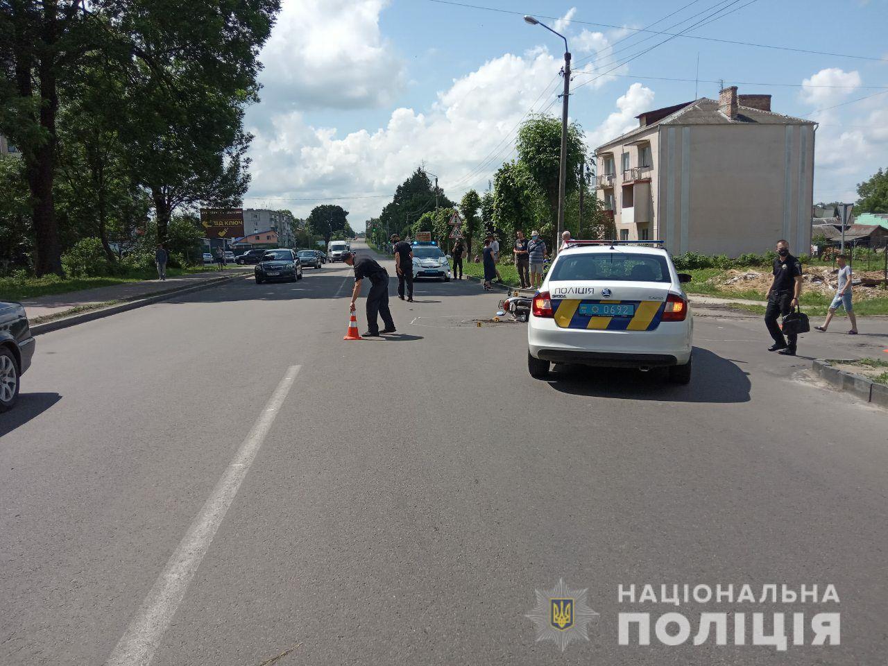 Слідчо-оперативна група встановила, що на вулиці Грушевського водій легкового автомобіля, здійснюючи поворот на вулицю Зерова, не вибрав безпечної швидкості руху та допустив зіткнення із попутним скутером «Honda» під керуванням 30-річної жительки села Судобичі. Потерпілу, яка має інвалідність 3-ї групи, доставили до лікарні із закритою черепно-мозковою травмою, забоями ноги та раною обличчя. Після надання медичної допомоги її відпустили.