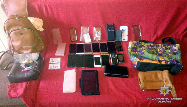 У зловмисника, жителя Полтави 1983 року народження, виявили 14 мобільних телефонів, планшет, зарядний пристрій, 4 жіночі сумки та 2 гаманці.