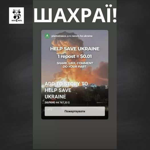 “Зараз інстаграмом несеться масове додавання отакої сторіс від компанії Plant A Tree Co нібито зі збором коштів для України. Це шахраї. Тому повидаляйте це, якщо ви запостили і відпишіться від них”, – йдеться у повідомленні.