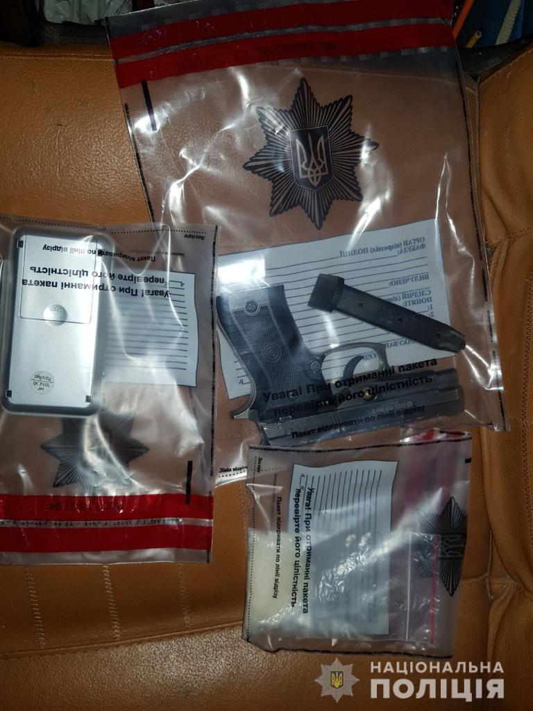 Співробітники поліції встановили, що зловмисником виявився 28-річний місцевий житель, у якого під час обшуку за місцем мешкання виявили та вилучили ручну гранату Ф-1 та запал типу УЗРГМ, переробний саморобним способом пістолет з двома патронами, психотропи, а також мобільні телефони, сім-карти та банківські картки.