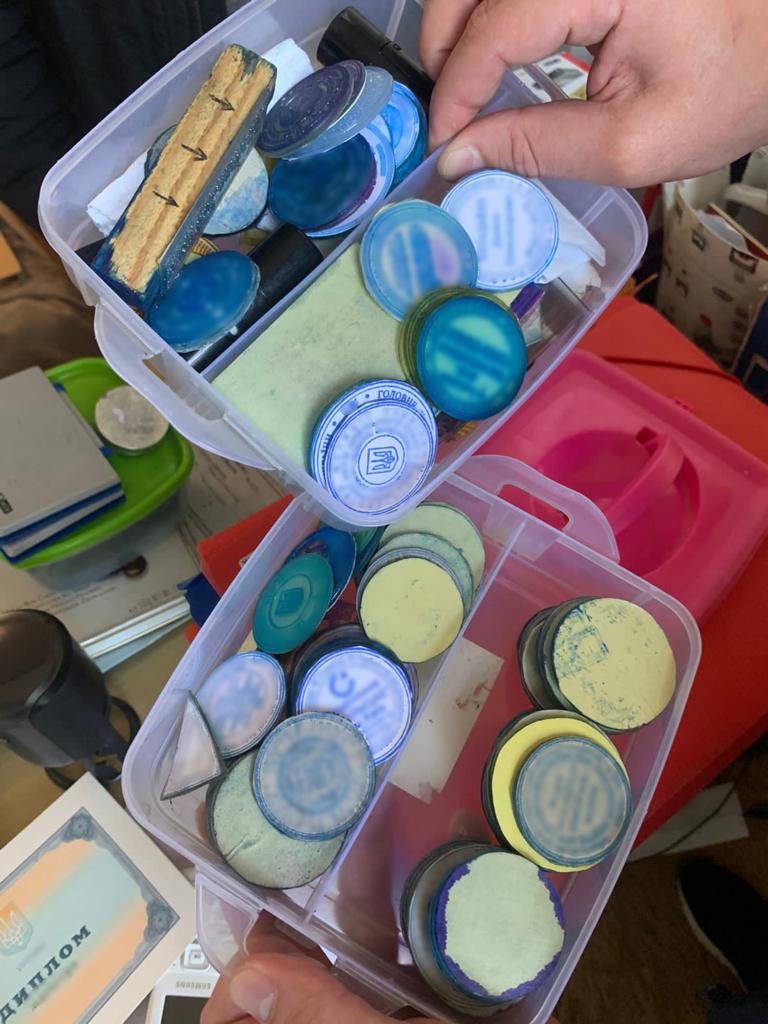 Правоохоронці провели обшуки за місцями їх проживання та виготовлення таких документів. Вилучено комп’ютерну техніку, мобільні телефони, техніку для друку та ламінування, близько 1500 печаток, бланки, голографічні елементи. Також під час обшуків вилучено клієнтську базу і готові підроблені документи.