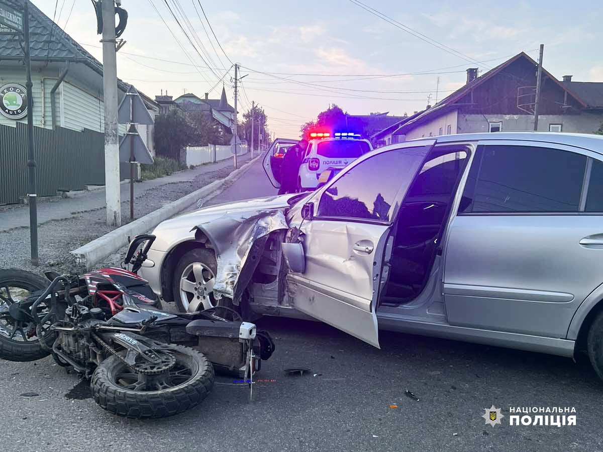 Інша автопригода трапилася в місті Кіцмань. На місці події співробітники поліції попередньо встановили, що 39-річний водій мотоцикла «TEKKEN 250» допустив зіткнення з автомобілем «Mercedes-Benz», під керуванням 20-річного місцевого жителя.