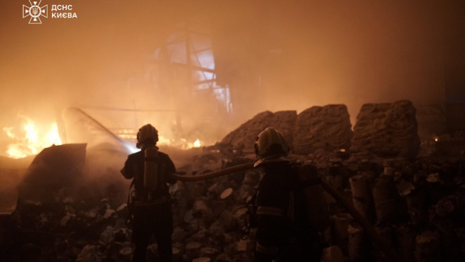 Станом на 05:00 внаслідок ворожої атаки, падіння уламків збитих БпЛА зафіксовано займання в Святошинському та Дарницькому районах Києва....