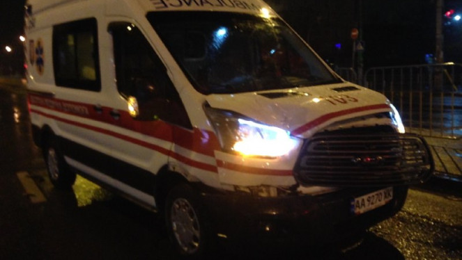 Дорожньо-транспортна пригода сталася на бульварі Перова вночі у Києві. Тут зіткнулось таксі і «швидка». На місці події працювала знімаль...