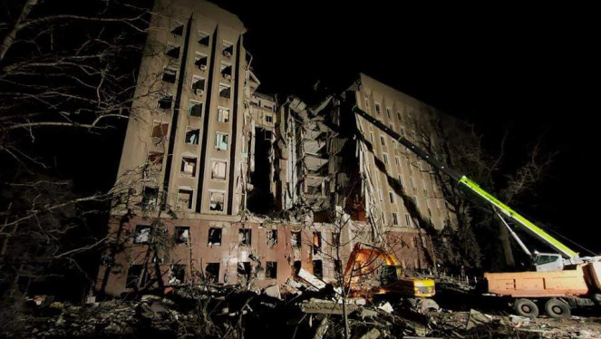 Всю ніч тривали роботи з розбору завалів та пошуку людей з-під них на будівлі облдержадміністрації, яка зруйнована внаслідок влучання во...