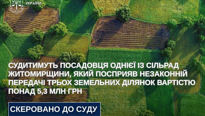 64-річний начальник структурного підрозділу Оліївської сільської ради Житомирського району сприяв незаконній передачі земельних ділянок ...