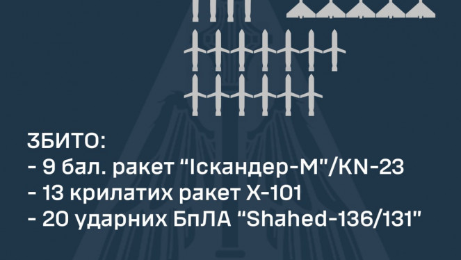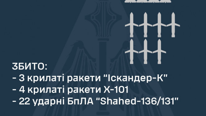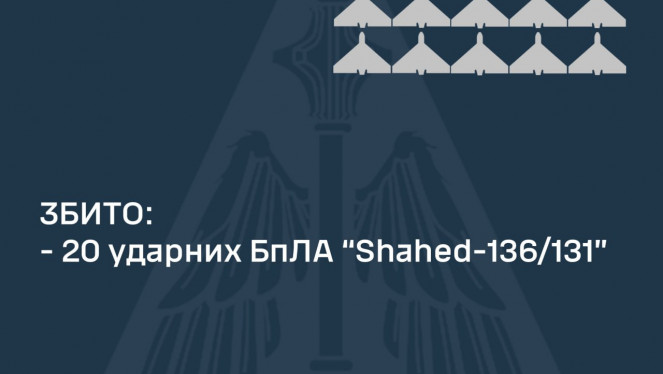 Минулої ночі ворог випустив по Україні 25 ударних БпЛА: 20 збито, ще 5 локаційно втрачено, - КПС ЗСУ